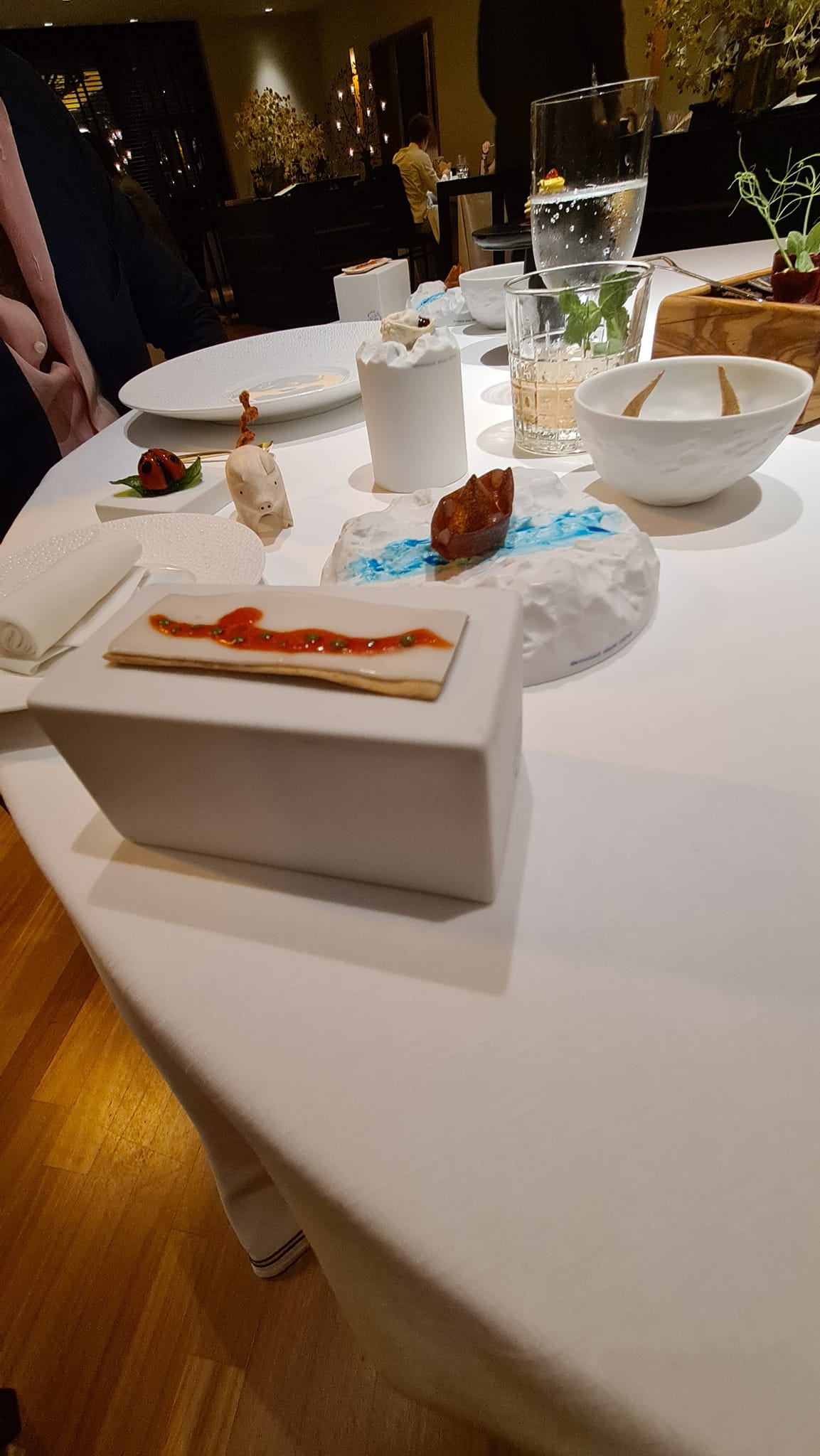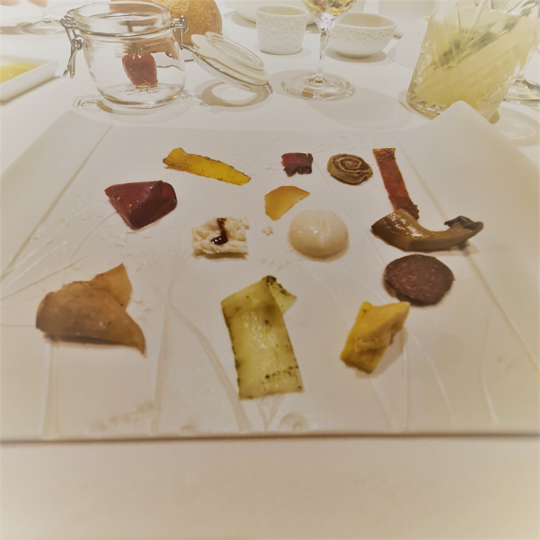 Il risultato è tanto divertimento con un solo buco nero e un rischio. Il buco è l’assenza di pasta secca (anche dal menu alla carta manca) assolutamente straniante nella regione della pasta e in un momento in cui tutti i grandi chef la propongono da Sud a Nord. Il rischio è un percorso forse troppo lungo per questo menu di 9 portate a cui si aggiungono i canapè e il carrello dei dolci, immaginiamo soprattutto la sera. Ma comunque, a compensazione, possiamo dire che è molto equilibrato (se si resiste ai pani e ci si modera nel bere), compresi buonissimi dolci finali di Roberta Merolli, la moglie abruzzese, che si annuncia già in alcuni pani e grissini.