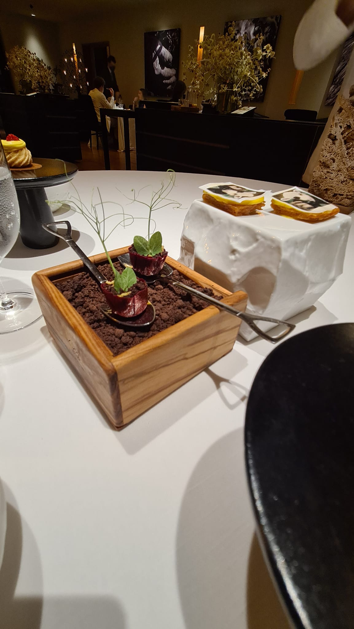 I canapè iniziali sono dedicati agli artigiani che collaborano con loro. Ogni boccone è legato ad un volto, una storia. Si parte dalla Tomba del tuffatore, icona pestana nel mondo e si continua con il racconta di chi gli fornisce erbe spontanee, chi gli cura l’orto, il macellaio di fiducia e via così. E’ bello conoscere la “famiglia” Tre Olivi, come primo passaggio della cena, da il senso del lavoro della squadra.