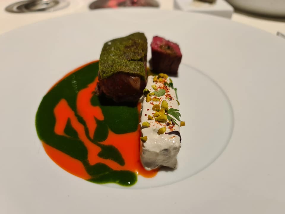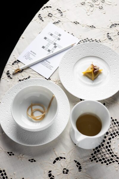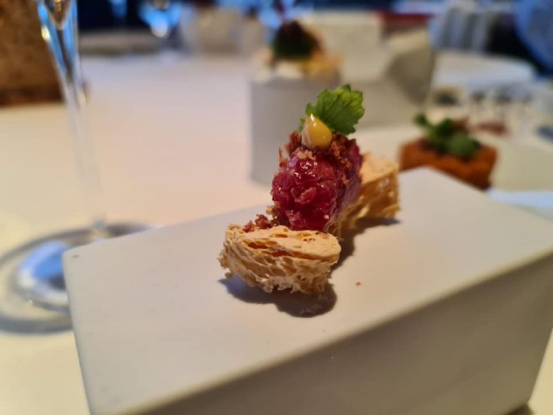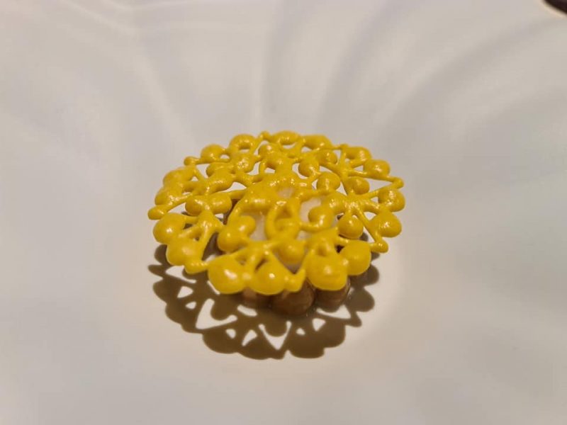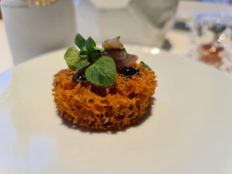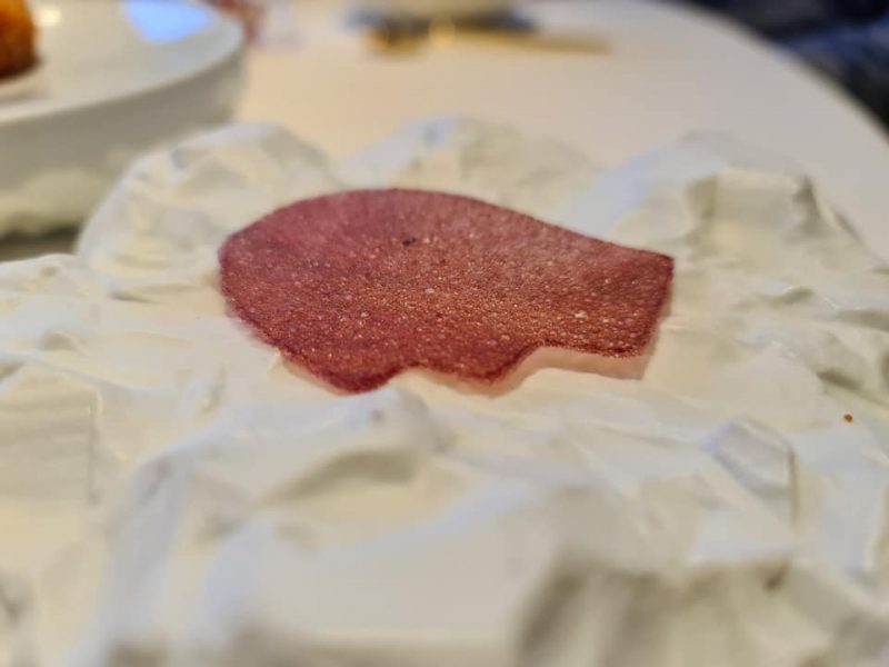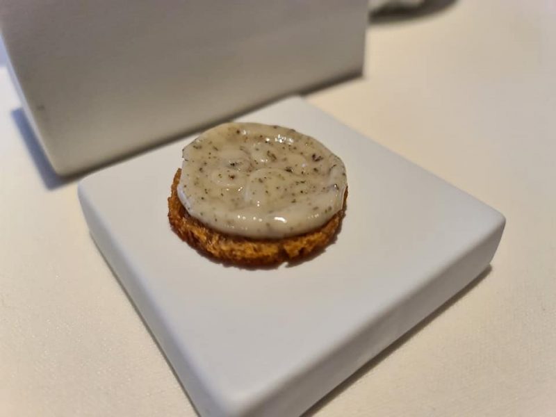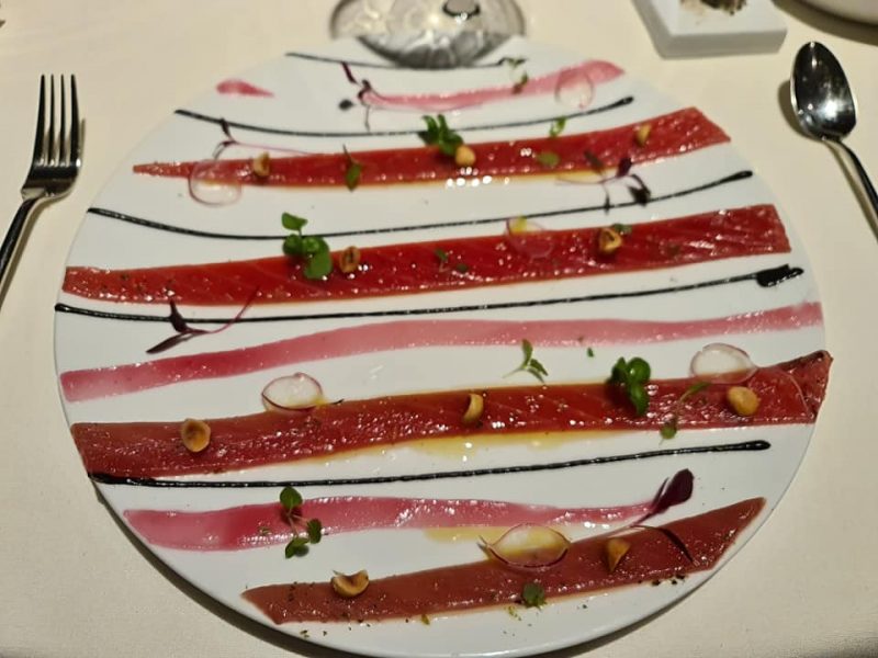 Crudo 2021 ricorda l’insalata di tonno. Un carpaccio di tonno rosso, accompagnato da un ristretto di olive nere al nero di seppia, nocciole, cipolla di Vatolla in carpione, ravanelli e pompelmo azotato. Molto bella la presentazione, la lieve acidità e cambio di temperatura del pompelmo, l’acidità più marcata del carpione di cipolla, rendono il piatto brioso, oltre ad una materia prima sopra le righe.