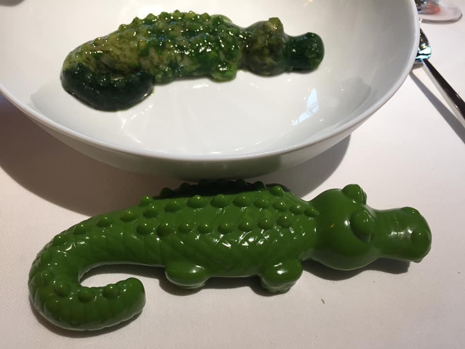 Un po’ perché nella cultura meridionale il vegetale è festa, un po’ perchè Giovanni si diverte nel parallelo fra vegetale e carne/salumi, il piatto del carrello dei vegetali è da solo una esperienza da fare e che noi ripetiamo volentieri. Come pure bissiamo il coccodrillo, un modo per far mangiare le verdure ai bambini, una finissima ed elegante minestra maritata senza eguali.