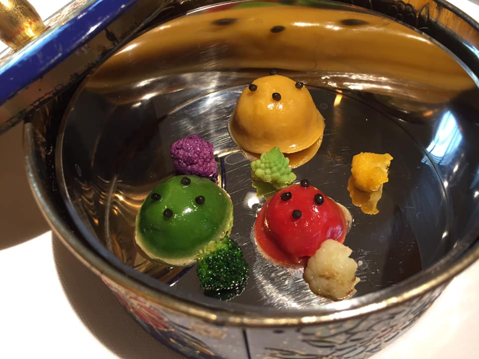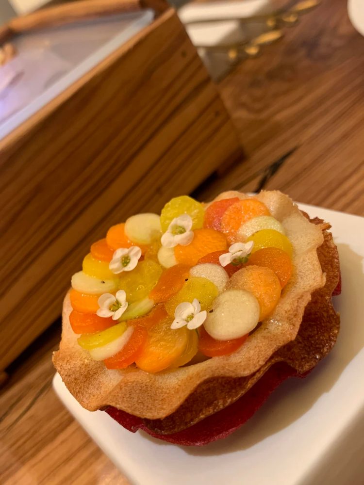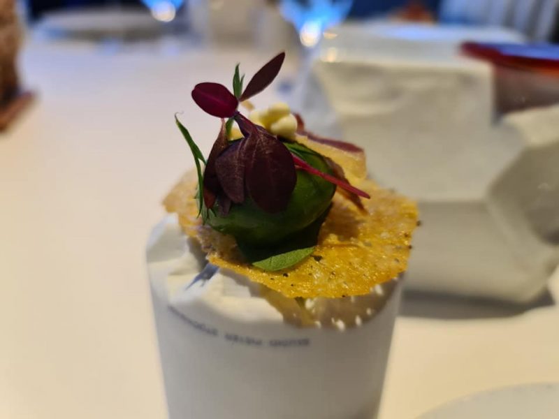 Il carrello dei vegetali da solo vale il viaggio, l’ho travato da subito geniale. Proporre delle preparazioni così lunghe e complesse, esplorare le potenzialità del mondo vegetale è un lavoro raffinato di tecnica, ma anche umanistico, avanguardistico e ironico. Servire una mozzarella, fatta con il latte di mandorla in terra di mozzarelle di bufale è il segno della grande ironia e della voglia di provocare, che non deve mai mancare per rendere un’esperienza a tavola completa.