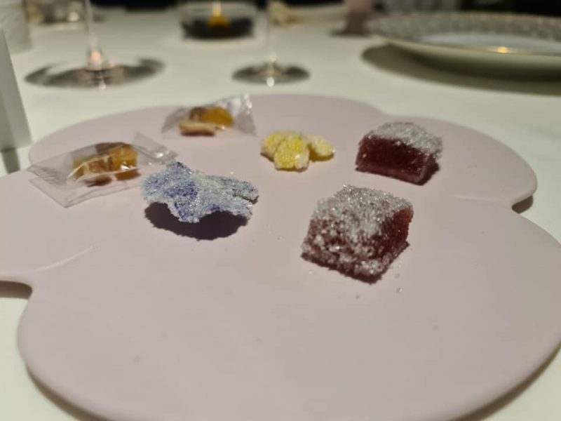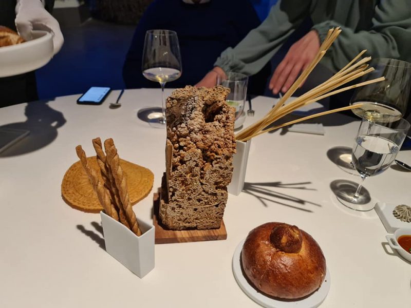 Il risultato è tanto divertimento con un solo buco nero e un rischio. Il buco è l’assenza di pasta secca (anche dal menu alla carta manca) assolutamente straniante nella regione della pasta e in un momento in cui tutti i grandi chef la propongono da Sud a Nord. Il rischio è un percorso forse troppo lungo per questo menu di 9 portate a cui si aggiungono i canapè e il carrello dei dolci, immaginiamo soprattutto la sera. Ma comunque, a compensazione, possiamo dire che è molto equilibrato (se si resiste ai pani e ci si modera nel bere), compresi buonissimi dolci finali di Roberta Merolli, la moglie abruzzese, che si annuncia già in alcuni pani e grissini.