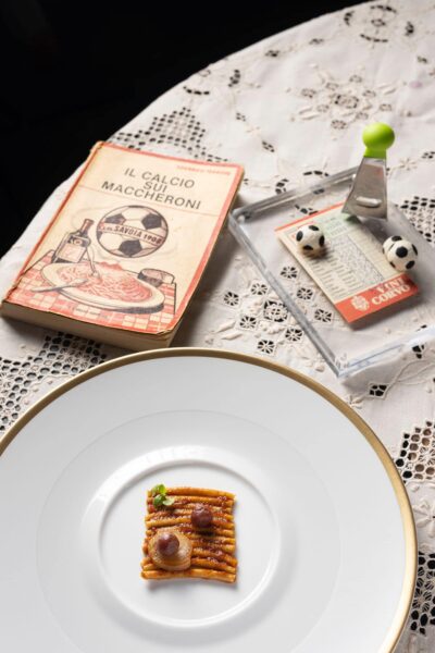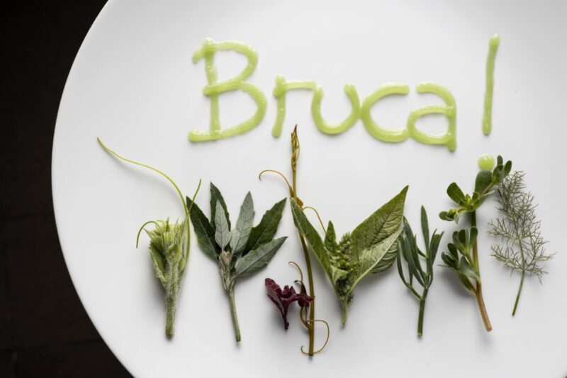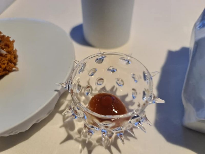 Bruca! Il primo boccone di un territorio. La natura che sceglie di restare, rinasce, si rigenera. Tutto vegetale con un lavoro tecnico importante sulla foglia di fico d’india, che diventa il condimento delle altre verdure. Violento, intenso, divertente, non solo nella presentazione, trova una profondità di gusto e di pensiero sul mondo vegetale strabiliante.