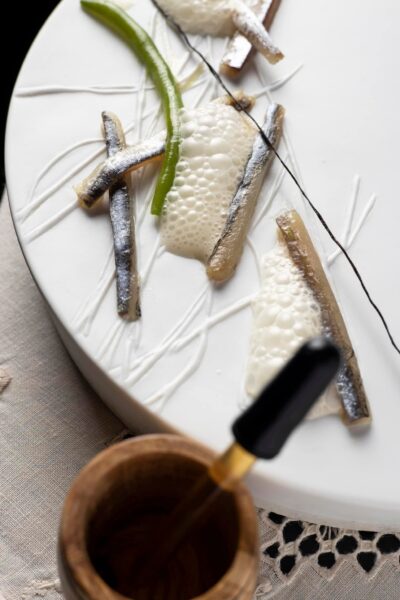 Briciole – quel che resta nel tavolo e Menaica- quel che resta nella rete, sono due diverse concezioni di intendere il mare. Nel primo caso i cannolicchi, dal gusto salino pronunciato, nel secondo le alici, delicate, eleganti, materiche.
