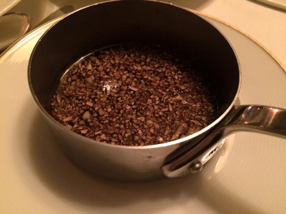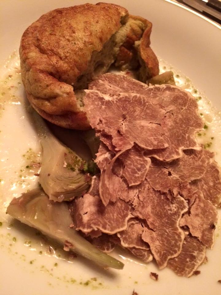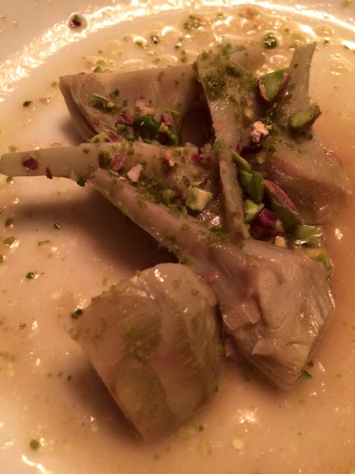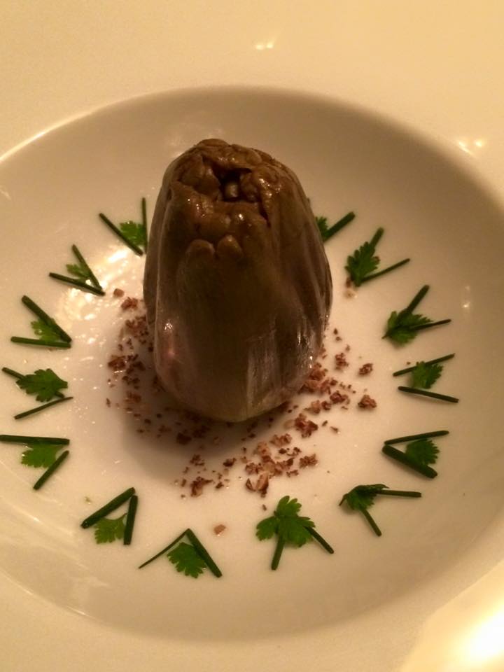 Il tavolo unanime rimane stordito da una batteria di piatti che fanno camminare il palato, mai scontati, ben lontani al neoclassicismo di Piege. Lo scampo con mousse di mandorla è strepitoso, il carciofo, inserito nel degustazione su richiesta di Peppe Di Martino, ci stupisce per la sua essenzialità rinviandoci a quello di Niko Romito o di Mario Sposito e, ancora, a quello di Luca Abruzzino. Adoro quando il vegetale diventa protagonista assoluto di un piatto a prescindere da pesce e carne. E non perché sia vegano, semplicemente perchè penso che ci voglia tanta capacità per fare grandi piatti vegetali.