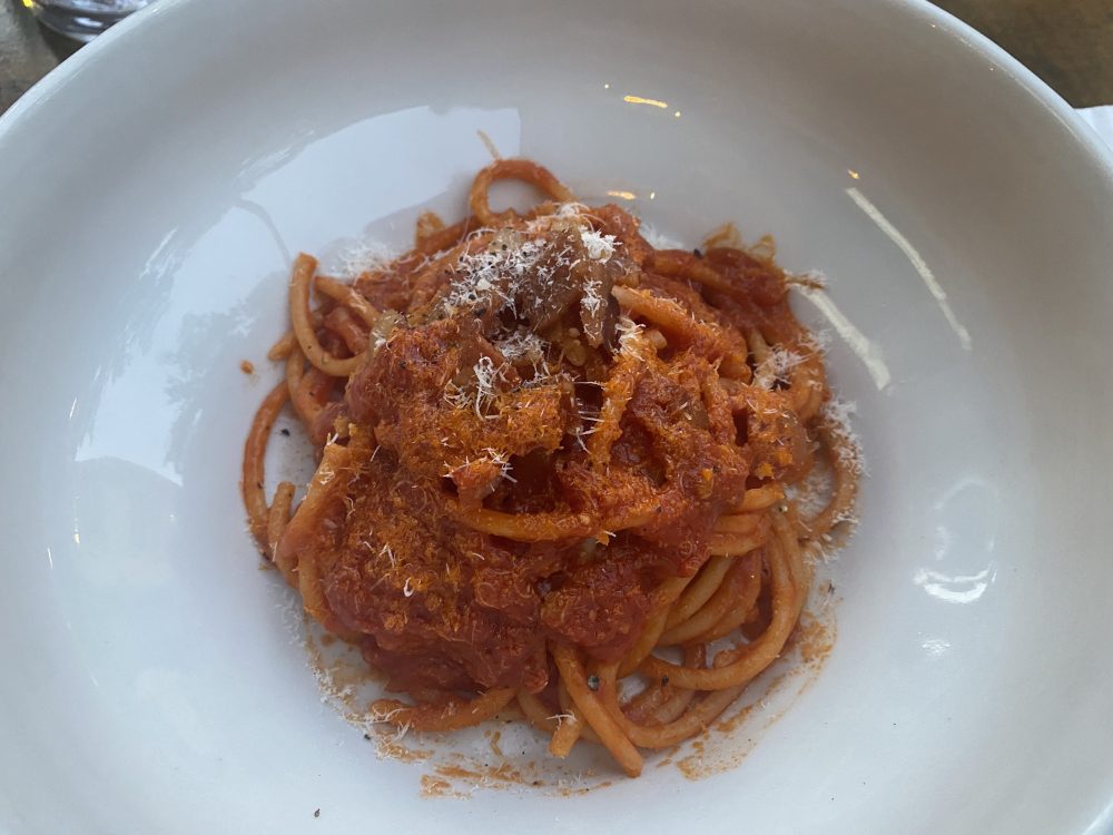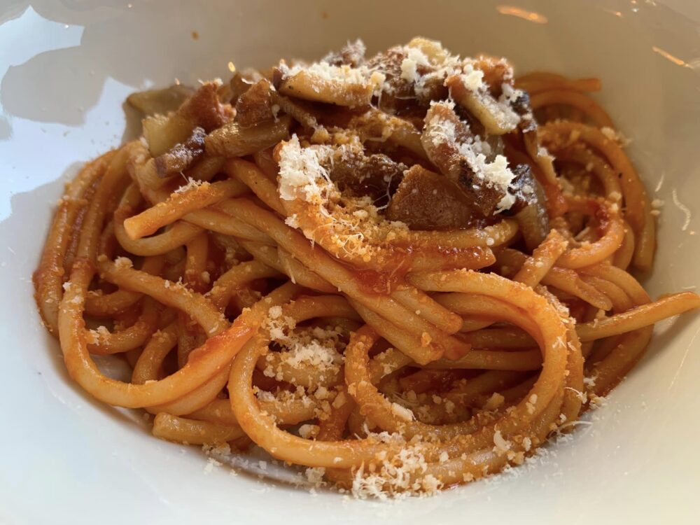Altrettanto soddisfacente la carbonara, ma la (ormai celebre) amatriciana dei fratelli Trecatstelli resta al primo posto: bucatini al dente, salsa corposa e grassa il giusto, gusto avvolgente e pieno, guanciale trattato alla perfezione e pecorino al suo posto.
