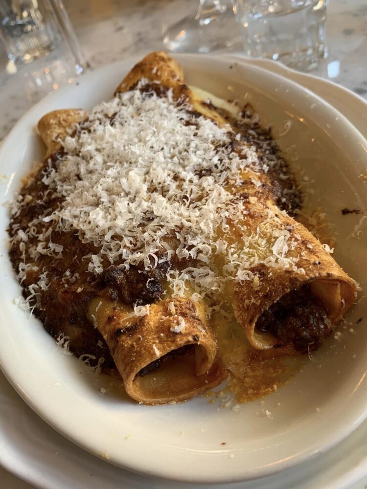 Venire qui e non assaggiare carbonara e amatriciana è un sacrilegio, perché da questi due classici è partita la rivoluzione del “#magnoforte”. Personalmente avrei preferito una cottura leggermente più al dente delle paste e un guanciale tagliato appena più spesso, ma, in fin dei conti, si tratta di versioni ampiamente sopra la media, soprattutto in termini di equilibrio e leggerezza. A spiccare, però, è la pappardella con la pecora della fattoria Faraoni di Sutri (VT): la carne ricorda per consistenza un ragù napoletano e l’equilibrio tra dolcezza, acidità ben dosata del pomodoro e nota selvatica tipica dell’animale è da applausi. Per trovare un primo a base di carne ovina migliore di questo bisogna inerpicarsi sull’Appennino.
