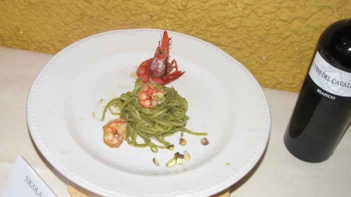 Dopo aver scolato le trenette cotte in abbondante acqua salata, metterle nel sugo ricoprendo il tutto con il pesto di pistacchio e amalgamare poi a fuoco lento.
