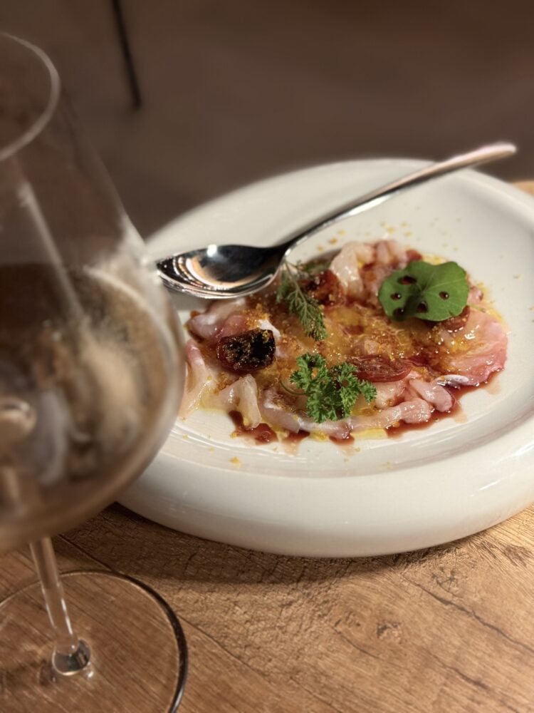 Carpaccio di cernia, olio allo scalogno, bottarga di spigola, aceto di vino rosso e pomodoro cannellino arrosto – Tribus Restaurant