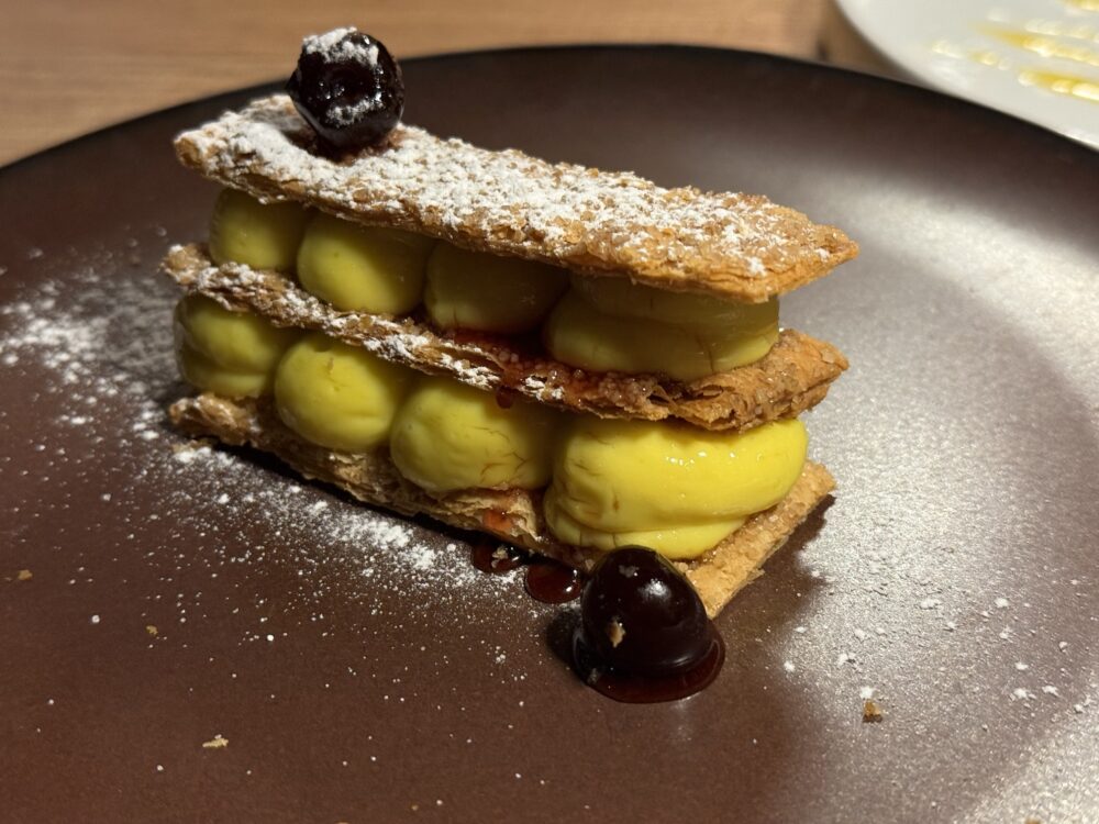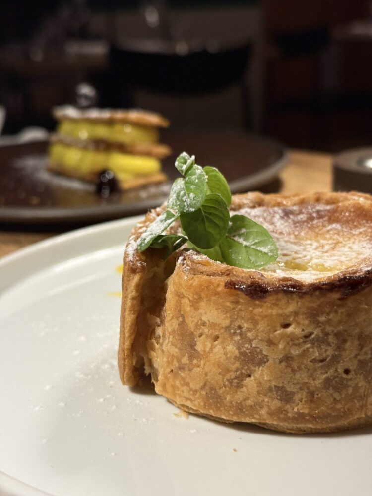 La parte dolce è tutt’altro che accessoria. La Tarte Tatin di mela annurca con caramello salato e gelato alla cannella e il Flan alla vaniglia con salsa al mandarino dei Campi Flegrei mostrano una pasticceria precisa, fondata su tecniche complete e su un’idea chiara di pulizia. La degustazione di formaggi con pane al cacao e rum aggiunge un tassello raro nella proposta del territorio.