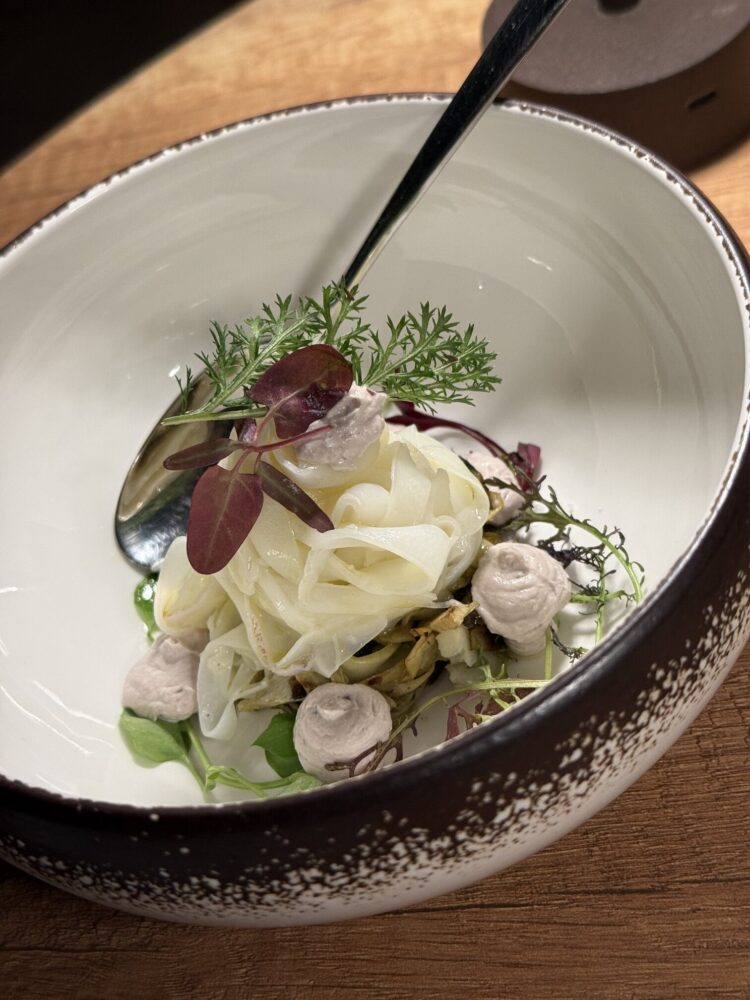 La percezione dei piatti conferma una cucina che lavora su consistenze precise e cotture misurate, evitando forzature e privilegiando la continuità aromatica. Anche i dettagli concorrono a definire l’identità del locale: il pane, prodotto in casa, ha struttura e profumo ben calibrati; durante la serata ho apprezzato l’uso dell’olio Mucrae – monovarietale Leccino (Benevento), un extravergine equilibrato, scelto per accompagnare alcune preparazioni senza sovrastarle.