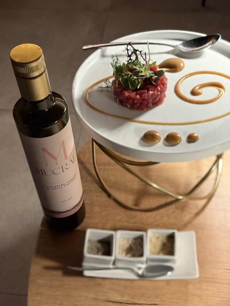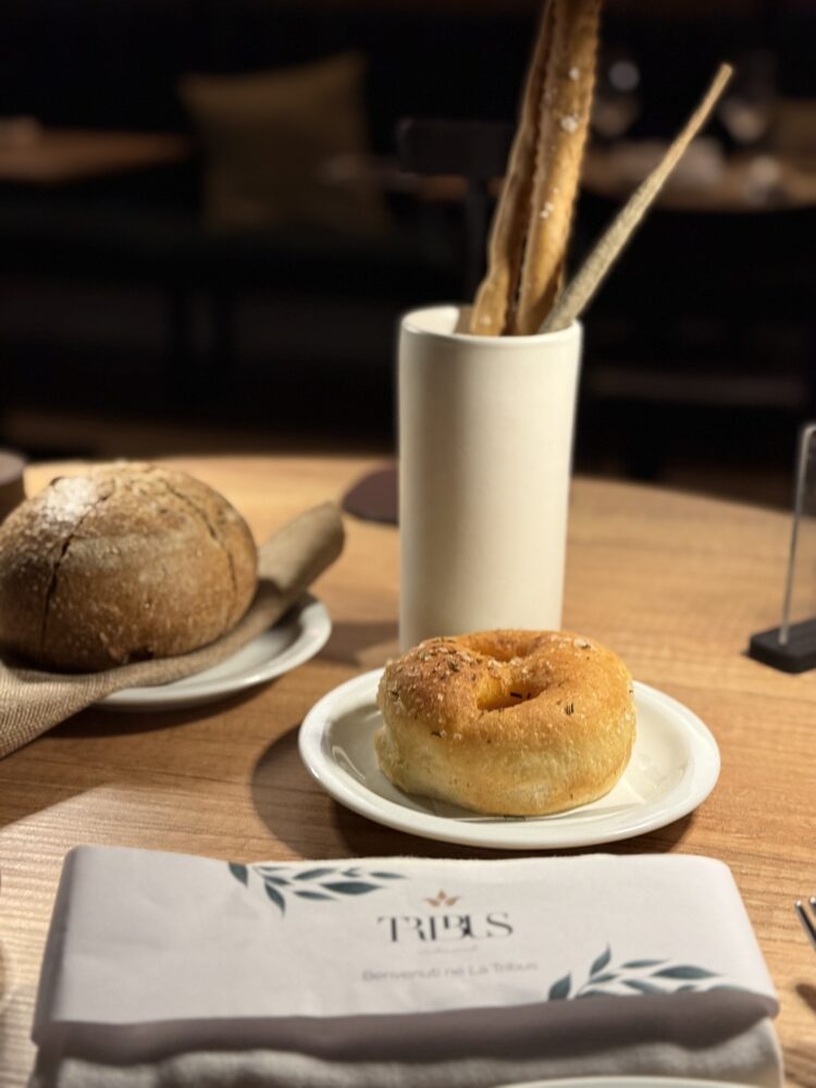 Al Tribus Restaurant l’esperienza culinaria è quindi tripla, chiaramente differenziata nella preparazione in cucina ma con un unico percorso gastronomico da seguire insieme. Il menù propone piatti che seguono la stagionalità e la freschezza del mercato, con prelibatezze come ostriche, tartufi di mare, gamberi, baccalà e alici. Per iniziare, i grissini alle alghe e il cestino del pane sono una vera meraviglia, accompagnati da un ottimo olio extravergine che rispecchia la cucina e la dieta mediterranea, pilastri della nostra gastronomia.