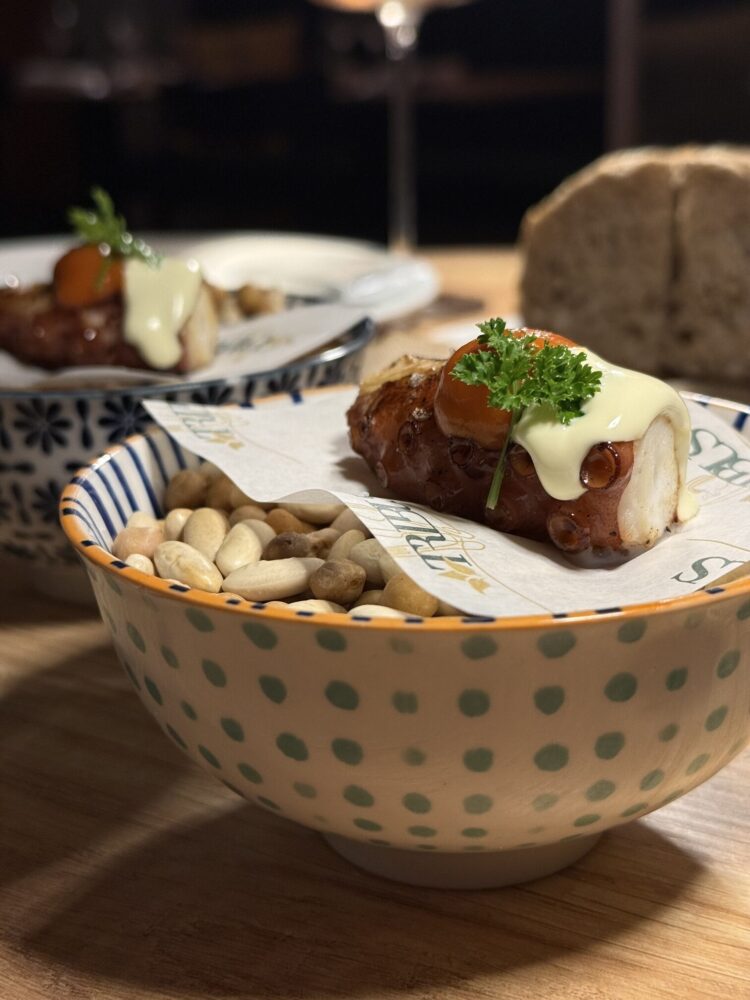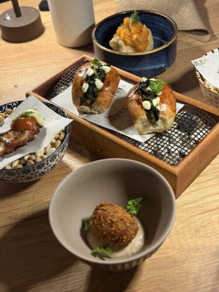 La carta dei vini segue una logica selettiva che valorizza i Campi Flegrei e i vitigni autoctoni, accanto a una scelta misurata di etichette italiane. Durante la cena ho scelto il Metodo Classico Cuvée Rosé di Francesca Carannante, una bollicina moderna a base di Pinot Nero: perlage fine, note di piccoli frutti rossi, freschezza verticale e una struttura che si è rivelata perfettamente compatibile con il percorso di tapas e con i piatti più sapidi della serata. Un vino che non appartiene al territorio flegreo dal punto di vista produttivo, ma che porta con sé la sensibilità di una giovane produttrice campana che ha costruito il proprio progetto in Oltrepò Pavese. Una scelta che dialoga bene con lo spirito del locale: radici solide, ma sguardo aperto.