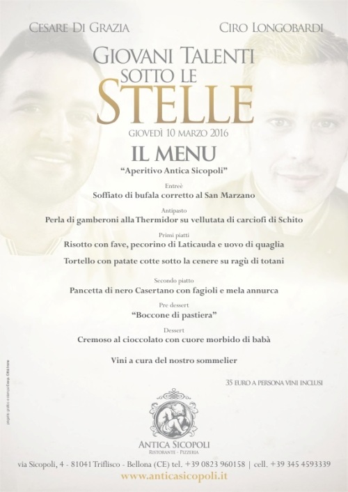 “Giovani Talenti sotto le Stelle” è l’appuntamento firmato da due volti nuovi e freschi della cucina campana, Ciro Longobardi e Cesare Di Grazia, in programma giovedì 10 marzo alle ore 20,30 al ristorante e pizzeria Antica Sicopoli a Triflisco, frazione del comune di Bellona in provincia di Caserta.