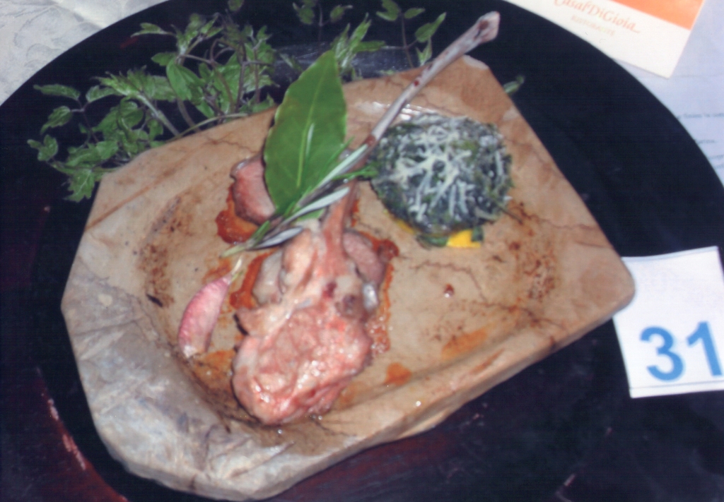 Giuseppe Di Gioia, vincitore assoluto della kermesse, è riuscito a conquistare la giuria con il piatto ‘Costoletta di agnello di razza laticauda scottata su pietra calcarea di Telese con millefoglie di vitalba su uovo di chicchinella’. Questo piatto ha esportato in terra umbra la particolare bontà della carne della razza ovina di origini africane e tanto amata dai Borboni, carne che si segnala per un contenuto più basso di colesterolo grazie all’accumulo dei grassi nella coda (laticauda=coda larga). Insolito poi l’accostamento con la millefoglie di vitalba, un’erba particolarmente comune (Clementis vitalba) di cui si utilizzano in cucina in genere i germogli raccolti nella stagione primaverile.