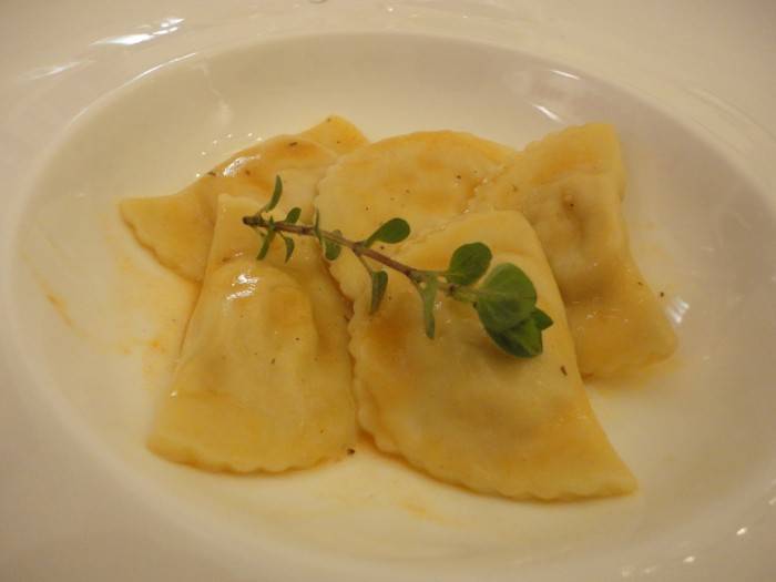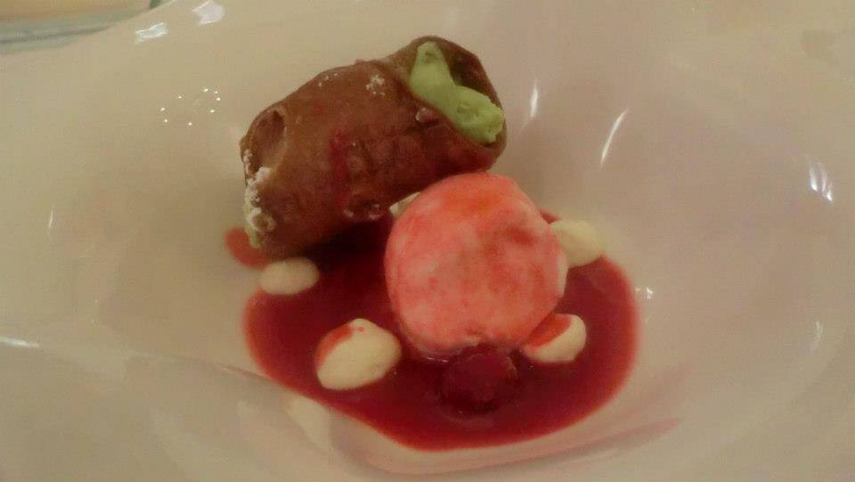 Sono a casa… i torcinelli, interiora d’agnello avvolte dalle budella dell’agnello stesso, erano molto simili ai “mugliatielli” dell’Irpinia. Il filetto di maiale molto succoso e gustoso, e fatevelo dire da uno che qualche maiale l’ha allevato, materia prima eccellente!!! In abbinamento il Negroamaro ’93 che avevamo degustato durante la verticale che precedeva la cena. Per le note di degustazione vi rimando a quelle del Pigna, che mi trovano in perfetta sintonia. Si chiude con un Cannolo al pistacchio, gelato al latte di capra, meringhette al limone e salsa calda di lampone.