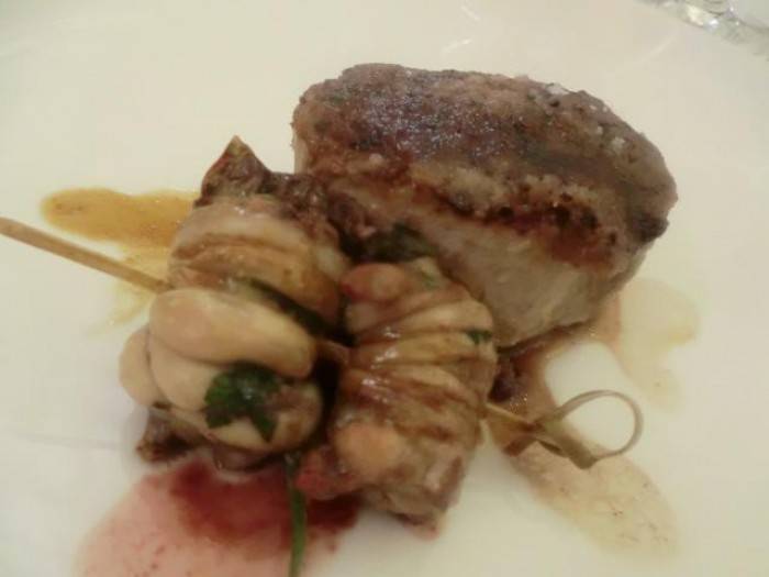 Un ripieno veramente fantastico, riuscire a dare un sapore così marcato alla carne di coniglio, notoriamente dai sentori molto delicati, non è da tutti. Il vino in abbinamento su questo piatto è il Mière rosato 2012, sempre della cantina Calò, da Negro Amaro (90%) e Malvasia Nera leccese(10%). Un bellissimo colore rosa chiaretto carico, frutta fresca a non finire, freschezza da vendere. Sembra dire…bevimi bevimi!!! . Filetto di maiale in crosta di fave di cacao e torcinelli alla brace .