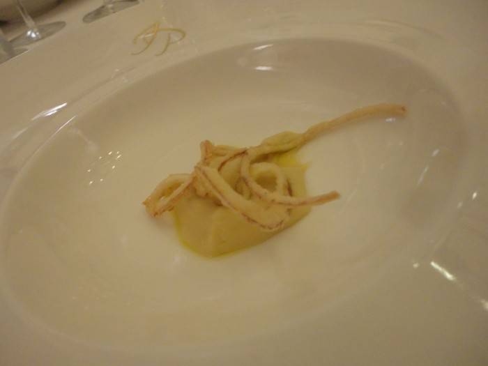 Partiamo con la Spuma di fave bianche con cipolla rossa di Acquaviva croccante. Territorio a go-go e tecnica a non finire. In abbinamento un Mière bianco 2012 uvaggio Verdeca e Chardonnay.