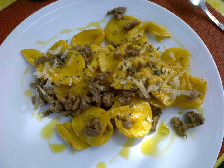 Buono il primo piatto, proposta consueta del menu di Mirandolina: papillon di pasta fresca allo zafferano – preparati da Susanne come tutta la pasta fresca in carta – conditi con ragù d’agnello in bianco profumato al timo. Anche l’altra specialità, le «foglie d’oliva» (pasta fresca acqua e farina) con pesto di pistacchi di Bronte e pomodorini è gustosa e gradevole, soprattutto in primavera.