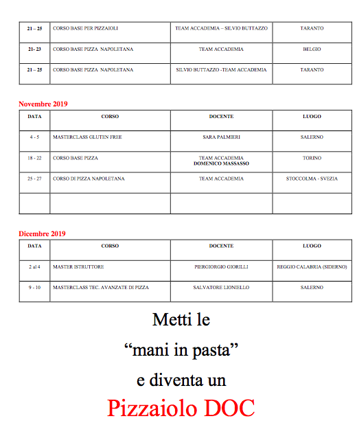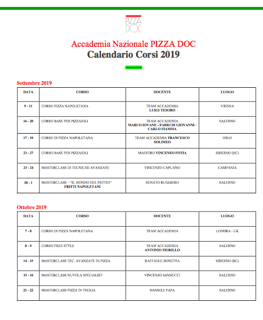 L’appuntamento è fissato dal 2 al 4 dicembre 2019. Il corso è rivolto a coloro che operano già del settore e desiderano diventare futuri Istruttori dell’Accademia Nazionale Pizza Doc. Al termine del corso verrà rilasciata un attestato di frequenza firmato dal docente con certificazione riconosciuta a livello internazionale UNI ISO 9001 : 2015.