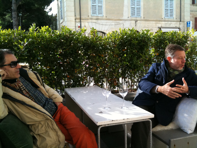 Per un aperitivo e le prime conoscenze ci si trova all’ Anikò di Moreno Cedroni. Compare un tipo strano: Matteo Zamorani Alzetta, fisicamente un tipo a mezzo fra Giuliano Ferrara e il meteorologo di Fabbio Fazzio, quello con il papillon. Erre moscia cotta al giusto punto, tipica dei due cognomi, il boy si farà Senigallia-Milano in treno al ritorno, con un “regionale veloce” di cui non conoscevo l’esistenza. È l’unico a sdoppiarsi, nell’aperitivo: per lui una birra baladin e come per tutti, un po’ di champagne, più esaurito di Alessandra Mussolini.