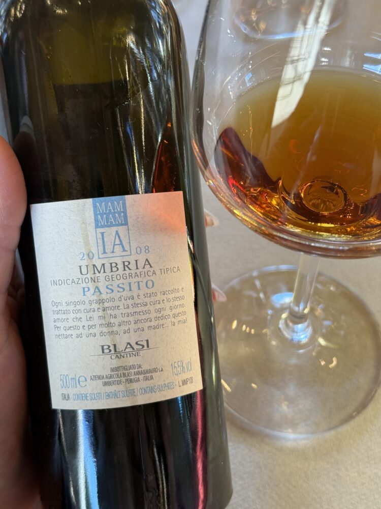 Blasi, ad Umbertide, è un viaggio a parte. Il loro “Mamma Mia” nasce da un’idea audace: unire Malvasia, Semillon e Chenin Blanc per creare un passito capace di coniugare tradizione e interpretazione personale. Le uve vengono raccolte a mano e lasciate appassire per un periodo molto lungo, che attraversa buona parte dell’inverno fino ai primi mesi dell’anno successivo. La fermentazione è lenta e seguita da un affinamento prolungato in piccoli caratelli da 125 litri, secondo una pratica che la cantina adotta da tempo. Ciò che ne deriva è un vino ambrato, ricco, segnato da note di miele scuro, frutta essiccata e spezie, con una complessità che si sviluppa nel tempo e che cambia nel bicchiere sorso dopo sorso.