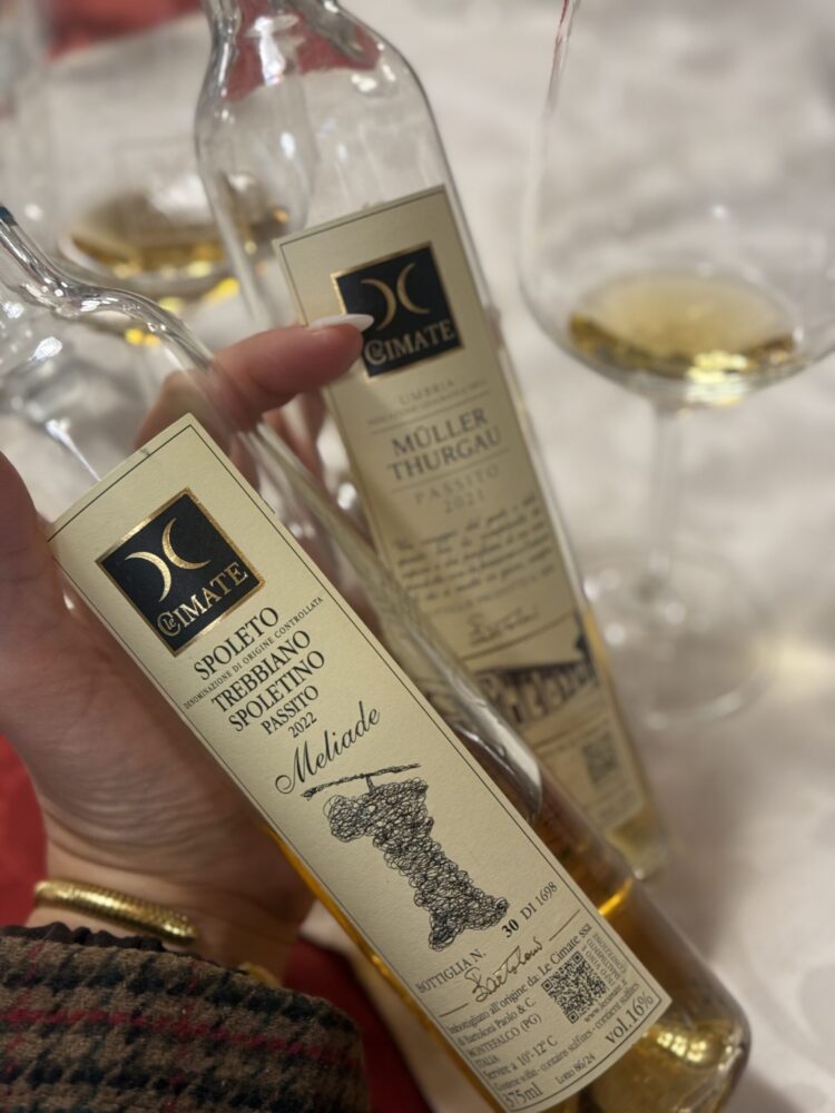 Le Cimate, sempre nella zona di Montefalco, dà al Trebbiano Spoletino passito un profilo sorprendente. Qui l’asciugatura avviene in camere ventilate per un periodo definito e costante, un processo preciso che richiede attenzione continua. La fermentazione si svolge in barrique e viene seguita da un periodo di affinamento che permette al vino di distendersi senza perdere la sua caratteristica vitalità. La gradazione naturale è importante, ma ciò che rimane nel calice è quella vibrazione minerale che solo lo Spoletino sa conservare anche quando diventa dolce: una freschezza che bilancia la morbidezza e che dà a questo passito un’identità luminosa.