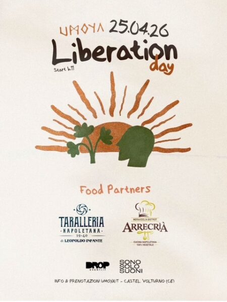 Umoya Liberation Day il 25 aprile a Castel Volturno per un evento che intreccia proposta gastronomica, musica e natura in un’esperienza di condivisione e convivialità. Il cibo diventa un racconto di identità e di territorio, accompagnando i diversi momenti della giornata, dalla mattina fino al tramonto. Protagonista è Umoya, affiancato da una selezione di partner gastronomici rappresentativi dell’identità napoletana e campana: la Taralleria Napoletana di Leopoldo Infante, Arrecria – Meravoglia Bistrot con la sua proposta vegana, il beer stand di MOSTO e il coffee corner firmato Caffè Sansone.
