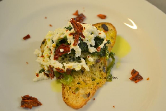 Millefoglie di pane alle olive con senapi dell’orto, ricotta fresca e peperone crusco dello chef Nicola Maino di Masseria Barbera