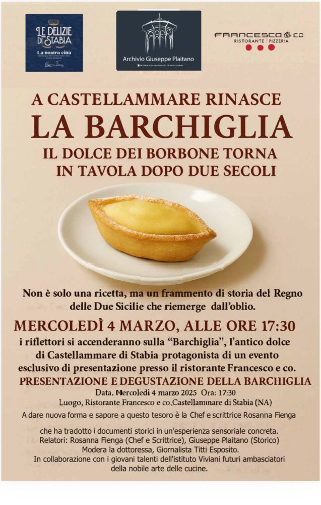 Un piccolo scrigno di pasta e profumi mediterranei capace di attraversare i secoli e tornare protagonista sulle tavole stabiesi. Mercoledì 4 marzo, alle ore 17.30, al ristorante Francesco & Co. si terrà la degustazione e presentazione della “barchiglia”, dolce storico che per lungo tempo è stato sinonimo di identità e raffinatezza per Castellammare di Stabia. Modera Titti Esposito.