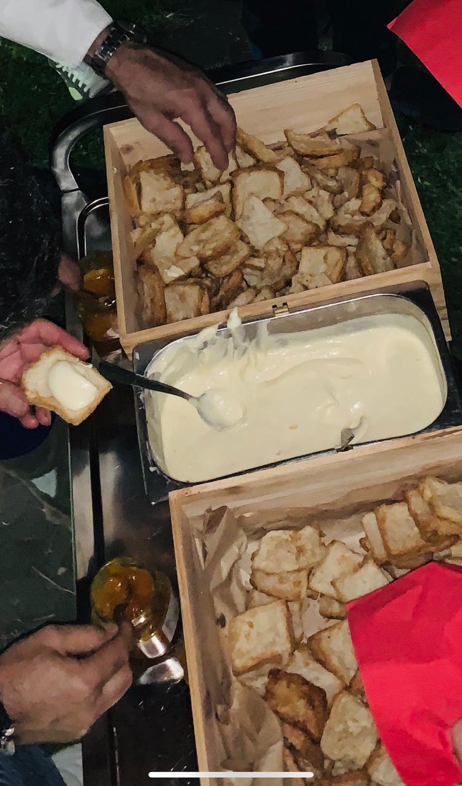 Prima del dolce, i ringraziamenti e i saluti di Massimo ai partecipanti e agli ospiti che richiama all’attenzione su un discorso trasversale in cui sottolinea l’importanza dell’agricoltura biologica, della biodiversità e delle “bellezze nostrane, sotto gli occhi di tutti, ma spesso poco valorizzate”. Massimo, invece, si spende molto per tutelarle e ritagliargli una forte identità nello scenario enogastronomico locale e nazionale. Non a caso, a tavola con lui c’è anche Agostino Casillo, Presidente dell’Ente Parco Nazionale del Vesuvio, che non può che andare fiero di realtà come queste. Dolci sono le note musicali della serata che accompagnano la cena fino al dessert, una sfogliata con crema a limone e confettura di “pellicchielle” del Vesuvio, le albicocche nostrane.