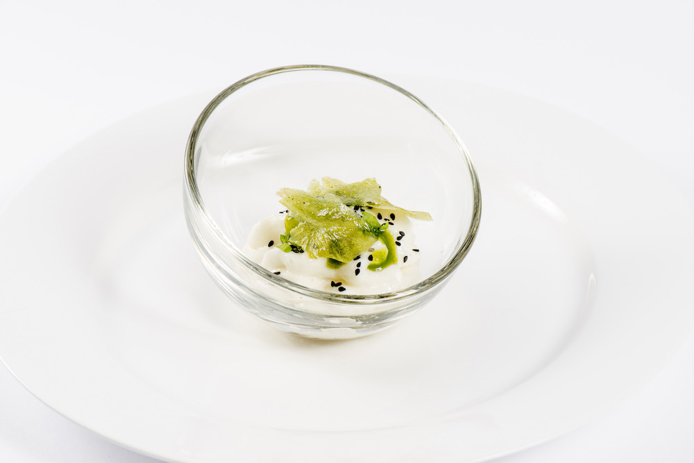 Cefalo Marinato in soia di mele e caffè, salsa di mandorle, melissa e macadamia,