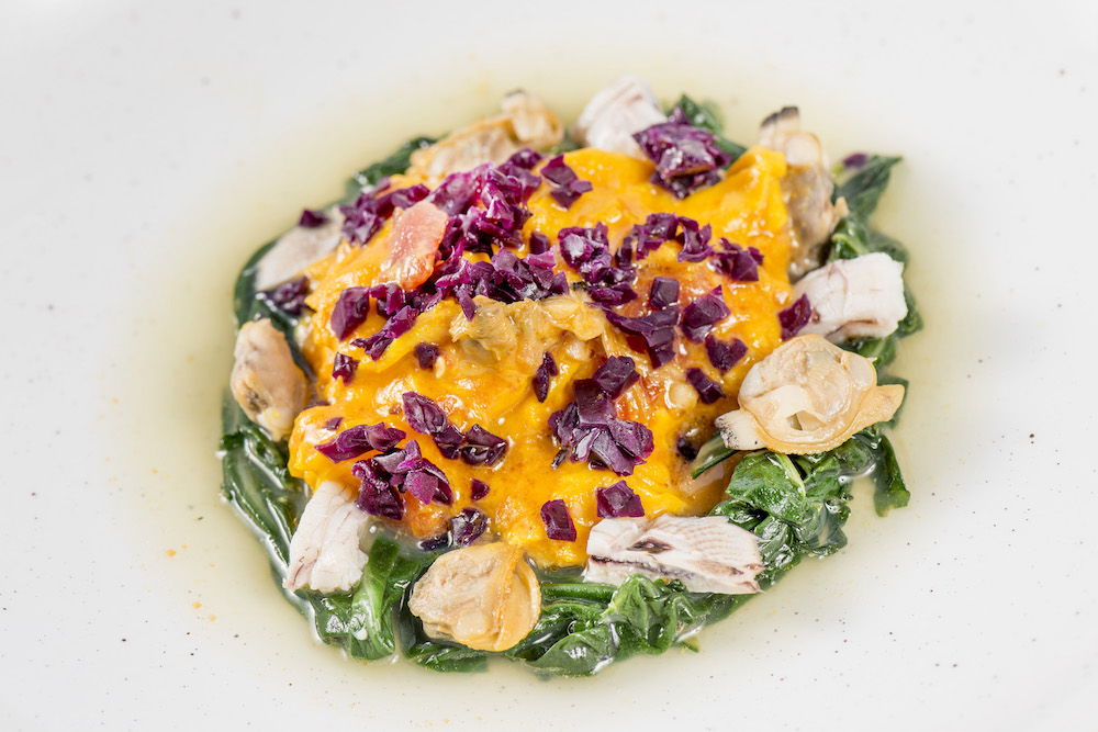 Cedroni – Frittatina alle cappole, brodo di bucce di bannocchie e cavolo viola fermentato