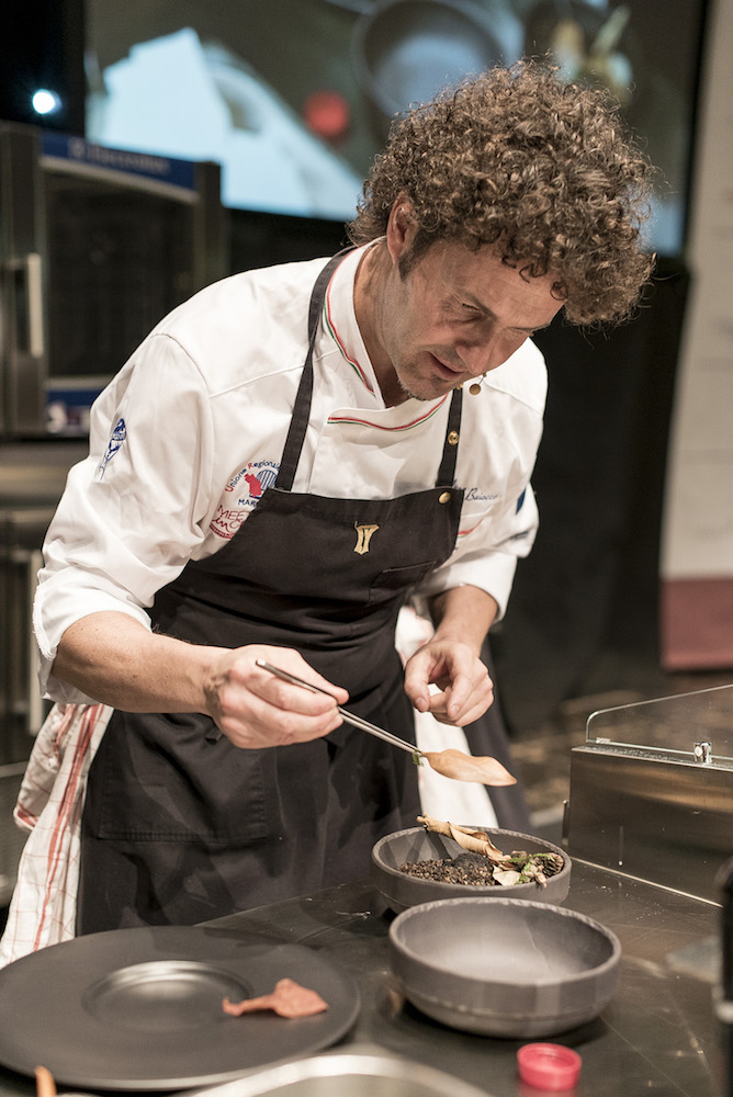 Ad aprire i lavori è uno brillante e sempre più attuale Lucio Pompili (de Il Symposium a Cartoceto, con una cucina incentrata sulla cacciagione vista la sua passione per la caccia, e antesignano dell’auto produzione degli ingredienti utilizzati in cucina, nonché grande selezionatore.