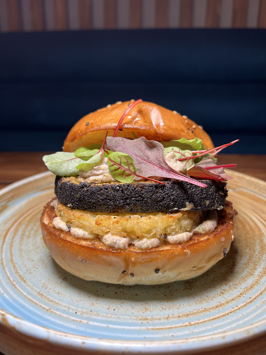 L’idea di questa preparazione nasce dai ricordi dell’esperienza milanese di Andrea, che ha pensato di inserire nel panino il riso ai funghi, un classico della cucina italiana, abbinato al porro. L’hamburger, sebbene vegetariano, è stato trattato come fosse un vero e proprio hamburger di carne, dunque cotto a bassa temperatura e scottato in padella.
