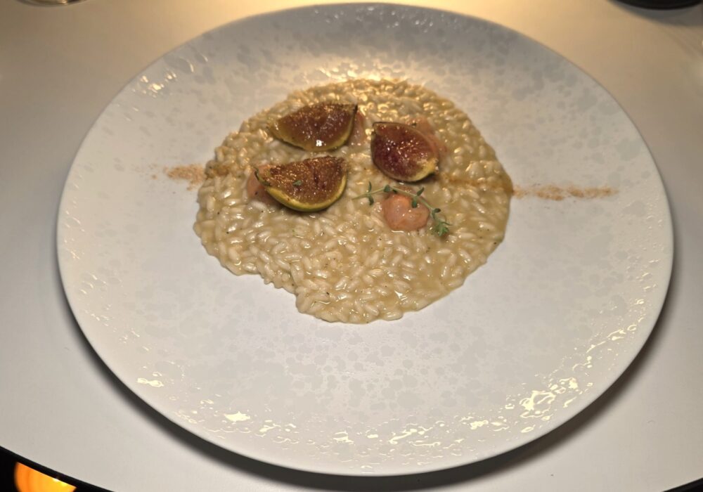 Arriviamo al piatto che più ci ha colpiti: risotto con fichi, scampi crudi e zafferano. La cottura del riso è perfetta, così come la sua mantecatura. Lo scampo, di eccellente freschezza e qualità si fa apprezzare sia da crudo, al primo assaggio, sia lievemente scottato dal calore del risotto quando lo abbiamo mischiato per sentire il sapore nel suo intero. Un gran piatto del quale, siamo certi, sentiremo parlare.