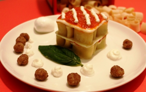 portare l’acqua di governo delle mozzarelle a bollore, calare i Campotti che andranno lasciati al dente (cuocere 8 minuti), controllare se è necessario aggiungere il sale, poi scolare la pasta. Con tutti gli elementi pronti, assemblare la lasagnetta, alternando un primo strato di sfoglia di mozzarella di bufala, sul quale si poggeranno n. 4 Campotti posti ad incastro rotante, per ridurre al minimo gli spazi; nei Campotti quali si andranno a sistemare le polpettine, poi uno strato sottile di ricotta e poi il ragù e qualche pezzettino di basilico; continuare per tre starti e finire con il ragù e striscioline di crema di mozzarella.