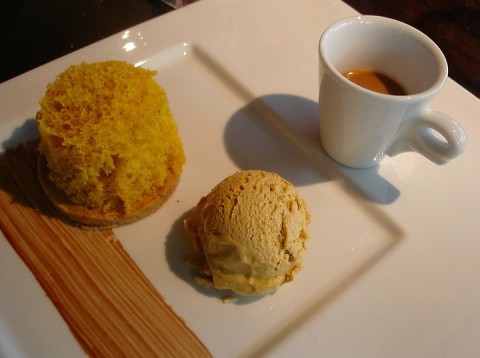 “Trippa di vitello, rognoncini di coniglio, crema di mais e caffè” come dice qualcuno… il piatto del viaggio! Nonostante la distrazione dell’arrivo di conoscenze in sala, ero combattuto tra finire il piatto, facendo finta di non averli visti, e il lasciar che il piatto si raffreddasse, per salutare doverosamente, perdendo forse qualcosa a livello papillare. La vinta l’educazione, ma al ritorno sul piatto mi son stupito, quanto anche da intiepidito, per non dire freddo, il piatto riuscisse ancor ad emozionarmi.