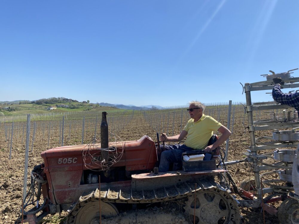 In una soleggiata e ventosa mattina di aprile ci accoglie, com’era prevedibile, sul trattore in mezzo a una delle sue vigne, in zona Montemarzino, intento a dissodare un filare. La sua figura smilza si staglia all’orizzonte, da lontano grida: “sono un contadino, cosa credete!”. E chi mai l’avrebbe dubitato.