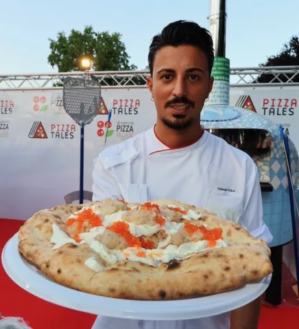 Il trentenne Antonio Falco, executive dell’Antica Pizzeria da Michele in the world, ha stupito con una allegra Pizz e spritz: stracciatella, tartare di scampi, zeste di arancia e coloratissimo caviale di spritz.
