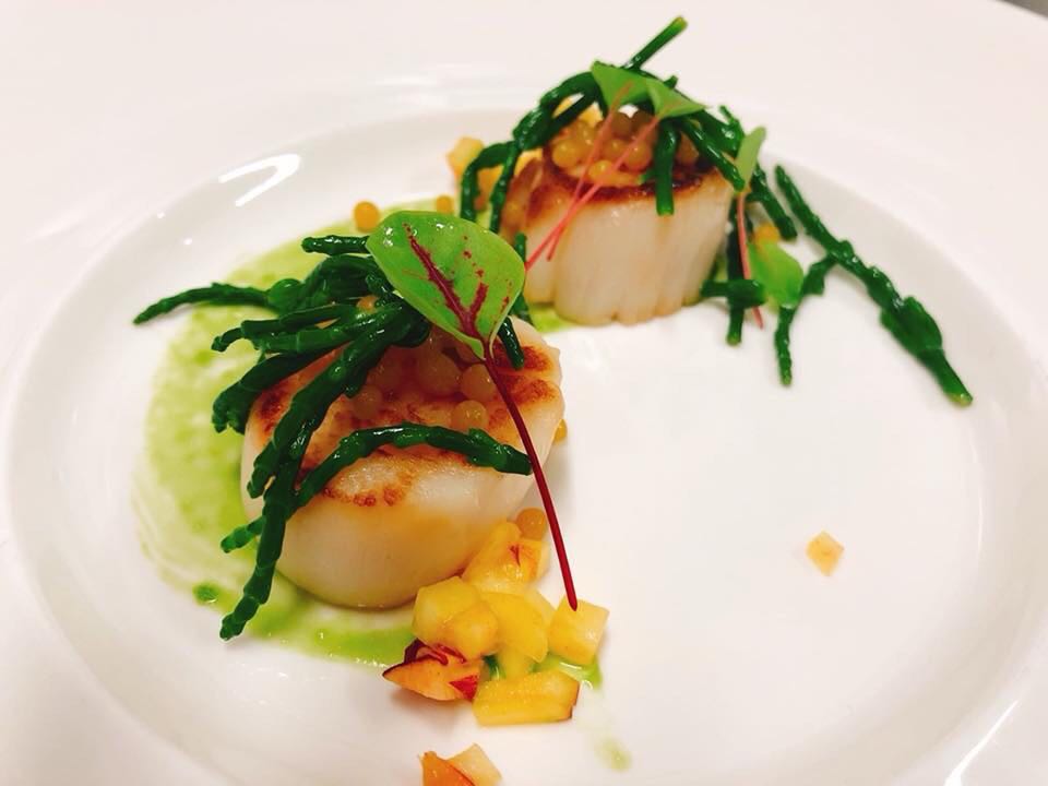 - Capesante con salicornia e perle di caviale di pesca nettarina