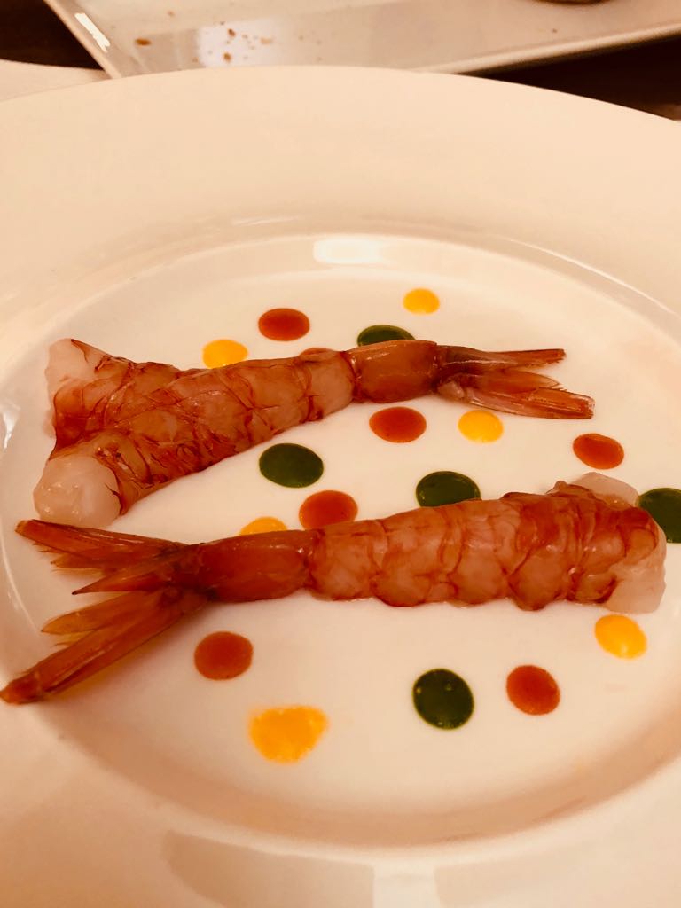 - Assoluto di Gambero Rosso di Mazara con gocce di prezzemolo, bisque di gamberi e frutti della passione.