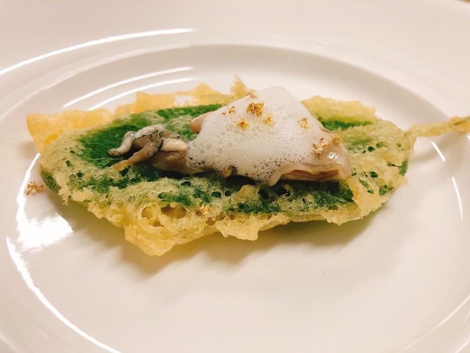 - Croccante di salvia fritta con ostrica e fiori di sambuco