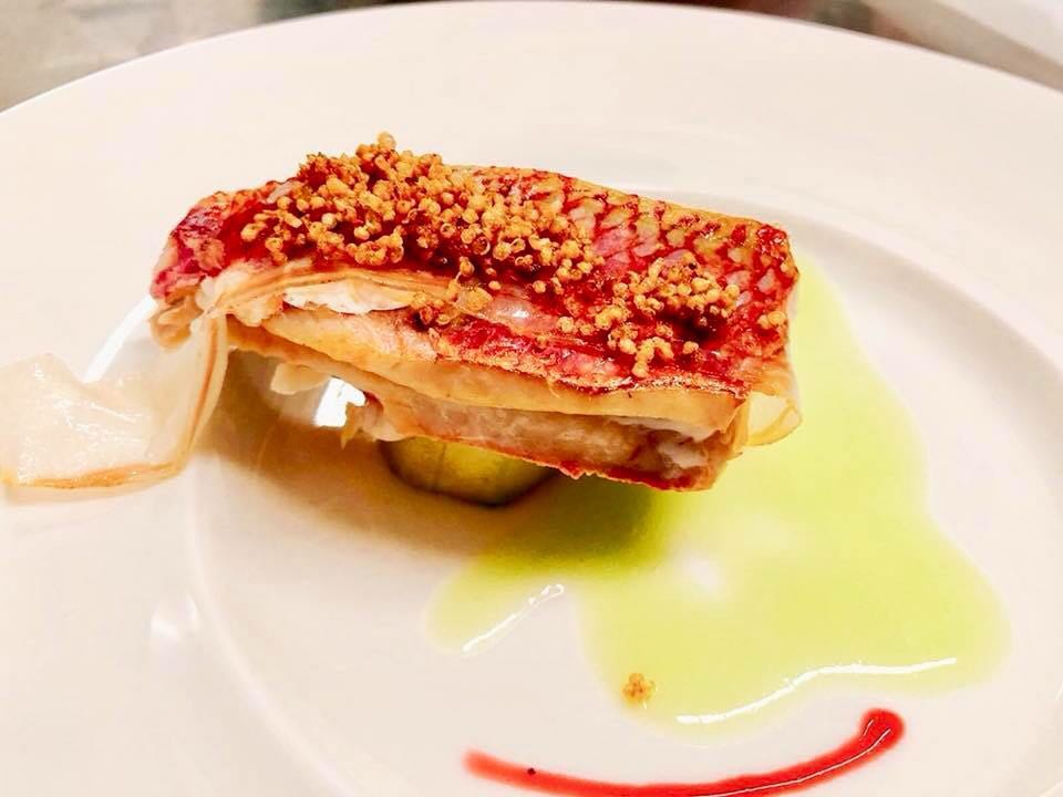 - Filetto di Triglia su cetriolo tostato e velo di guanciale di Patanegra