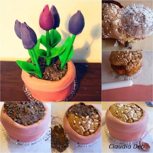 Taglia del cioccolato fondente a scaglie e applica al centro del vaso in modo da simulare il terreno. Completa il tutto “piantando” i tulipani nella terra (per ogni fiore, infilza nella colomba la parte di stecco che fuoriesce dallo stelo).