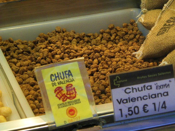 Attorno Valencia ci sono fiorenti colture di prodotti di altissima qualità e spesso a Denominaciòn de Origen ; l’ortofrutta in particolare tra cui le sue gustosissime arance o il riso coltivato lì,vicino vicino al parco nazionale dell’Albufera. Tra i prodotti DO ricordiamo quindi i nostri Chufas “Chufa de Valencia – Denominación de Origen” . Provenienti principalmente da Alboraya, non sono altro che tubercoli delle radici della pianta Cyberus Esculentus. Si lasciano lentamente seccare per circa 3-4 mesi . Selezionati ancora manualmente, prima di essere messi nei tipici sacchi , si reidratano e vengono quindi macinati; La pasta de chufas così ottenuta viene semplicemente addizionata ad acqua e zucchero, filtrata et voilà: l’horchata è servita. Ovviamente, come ogni bevanda popolare, ha una sua versione industriale , pastorizzata, reperibile in polvere o pronta da bere .L’horchata, quella naturale, si conserva per massimo tre giorni. In Italiano la traduzione di chufa è babbagigi; più comunemente viene detto mandorla di terra , riprendendo poi l’origine araba della parola “babbagigi” “habb’aziz” cioè mandorla buona. Amici Uruguaiani, ormai cittadini di Valencia da più di 10 anni, non riescono ancora ad abituarsi alla bevanda , che, confesso, ho trovato molesta al primo e a dirla tutta anche al secondo e terzo assaggio. Sorvolando però su giudizi poco rappresentativi, dobbiamo dire che è un bibitone salutare: contiene molte fibre, vitamine e aminoacidi.