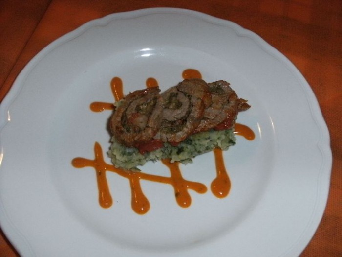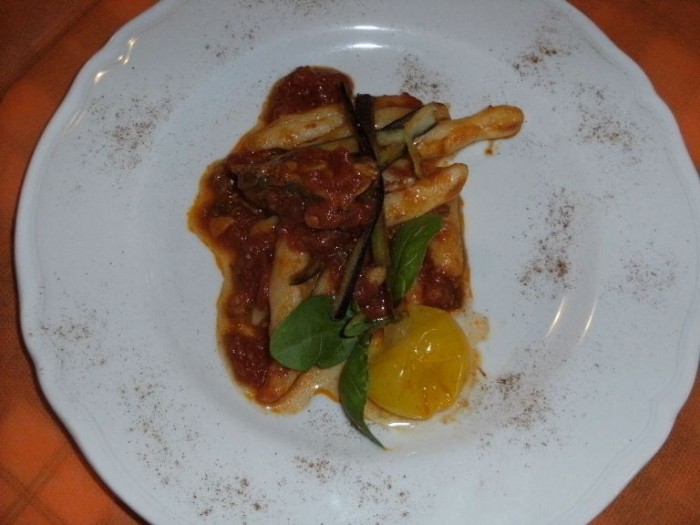 La prima portata è un classico della cucina cilentana leggermente rivisitata: parmarieddi (una sorta di fusilli incavati con il palmo della mano), alle erbe, con ragù di braciole di vitello e pomodoro giallo. E che ne parliamo a fare! Certe sensazioni epicuree, edonistiche e lussuriose vanno vissute di persona e centellinate senza fretta e quindi non si ottiene alcun risultato tangibile se si vogliono trasmettere per via etere, ma bisogna viverle personalmente e basta!
