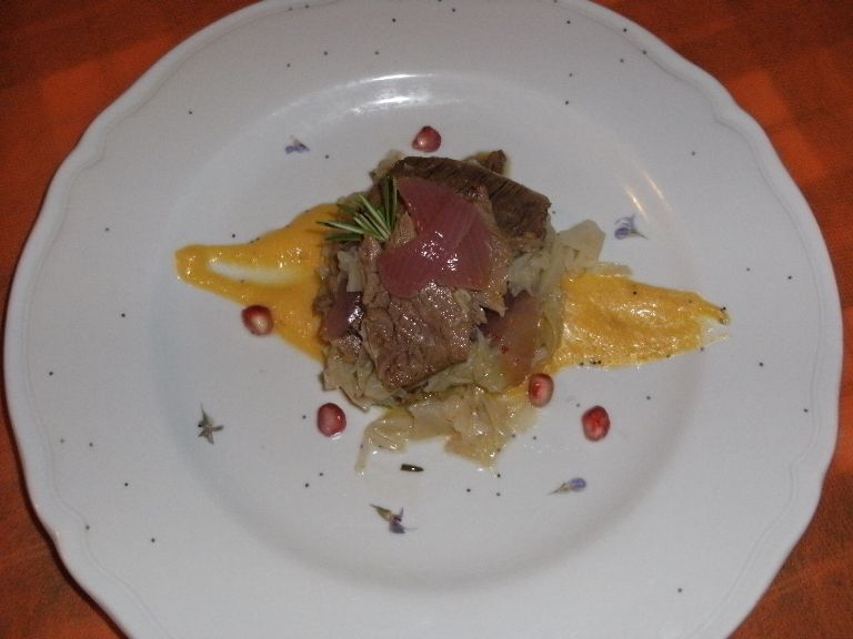 Per secondo piatto un affettato di braciola di vitello con rape e patate e riduzione di peperone corno all'agrodolce. Sostanzioso ed appagante. Altro secondo: carpaccio di bollito di vitello alle cipolle di Tropea, insalata scottata di verza e crema di zucca e melograno. Certamente la fantasia non fa difetto a Carmela! E nel complesso anche questa preparazione è ottima.