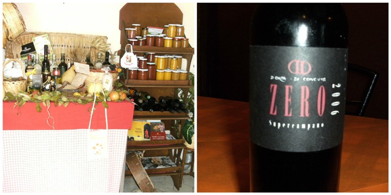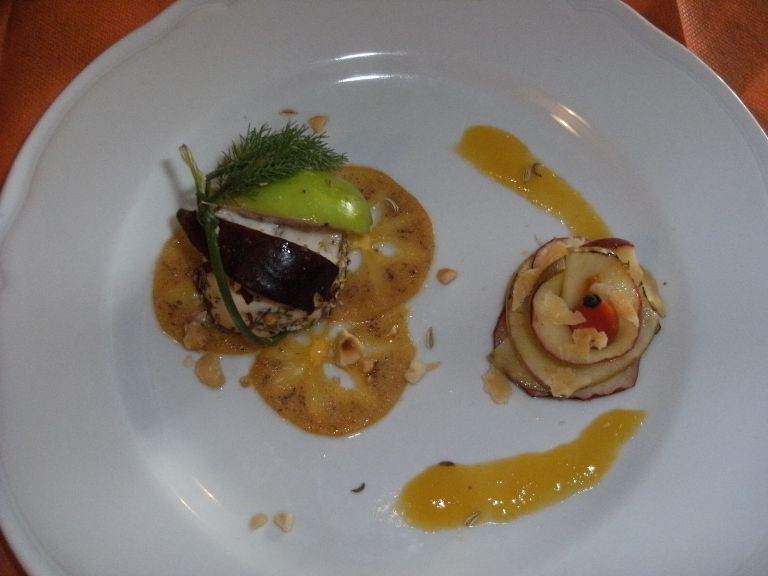 S'incomincia con un tomino di pecora agli aromi mediterranei, con fichi freschi, carpaccio di cachi, mele grigliate e scaglie di caciocavallo podolico. Piatto delizioso e nell'insieme ottimamente assemblato, con il buonissimo tomino fornito da un pecoraio che abita solitario in montagna e che è molto geloso della sua minimalista produzione come mi racconta Angelo, ma proprio per lui fa un'eccezione.