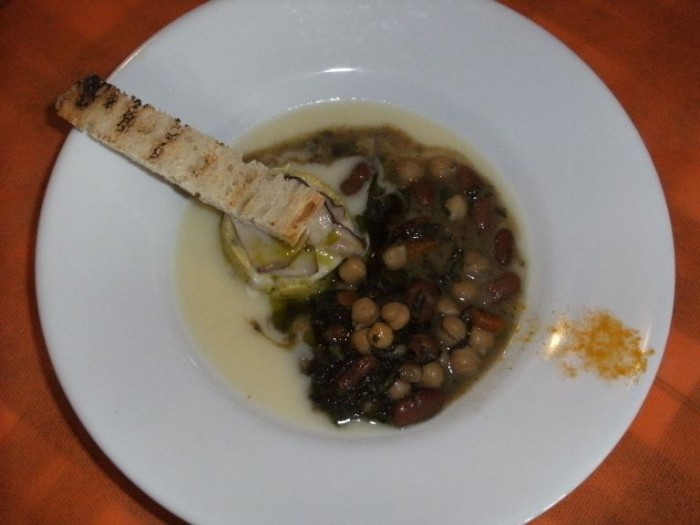 In accompagnamento un tradizionale calzone cilentano ripieno di scarola ed alici. Un altro antipasto, ma che potrebbe essere comunque un primo piatto, è il pane cotto, con funghi porcini, crema al tartufo d'Alba e zuppetta terranea di ceci di Controne e fagioli della regina di Villa Littorio. Beh, direi che questa portata vale da sola il viaggio fatto per salire fin qui. Una goduria irrinunciabile per il palato, laddove gli ingredienti sono amalgamati sapientemente e trovano riscontro in un sapore unico ed incommensurabile.